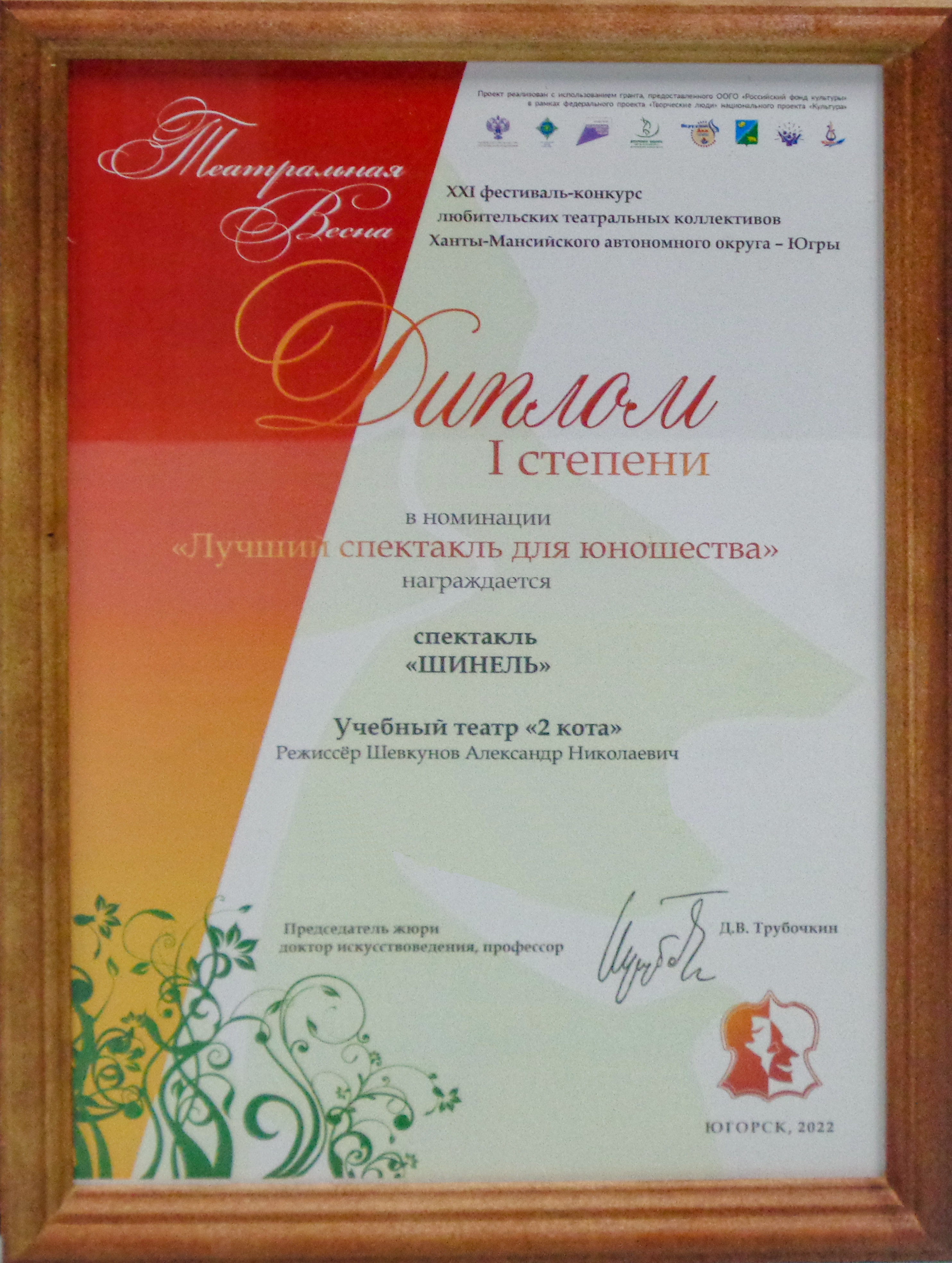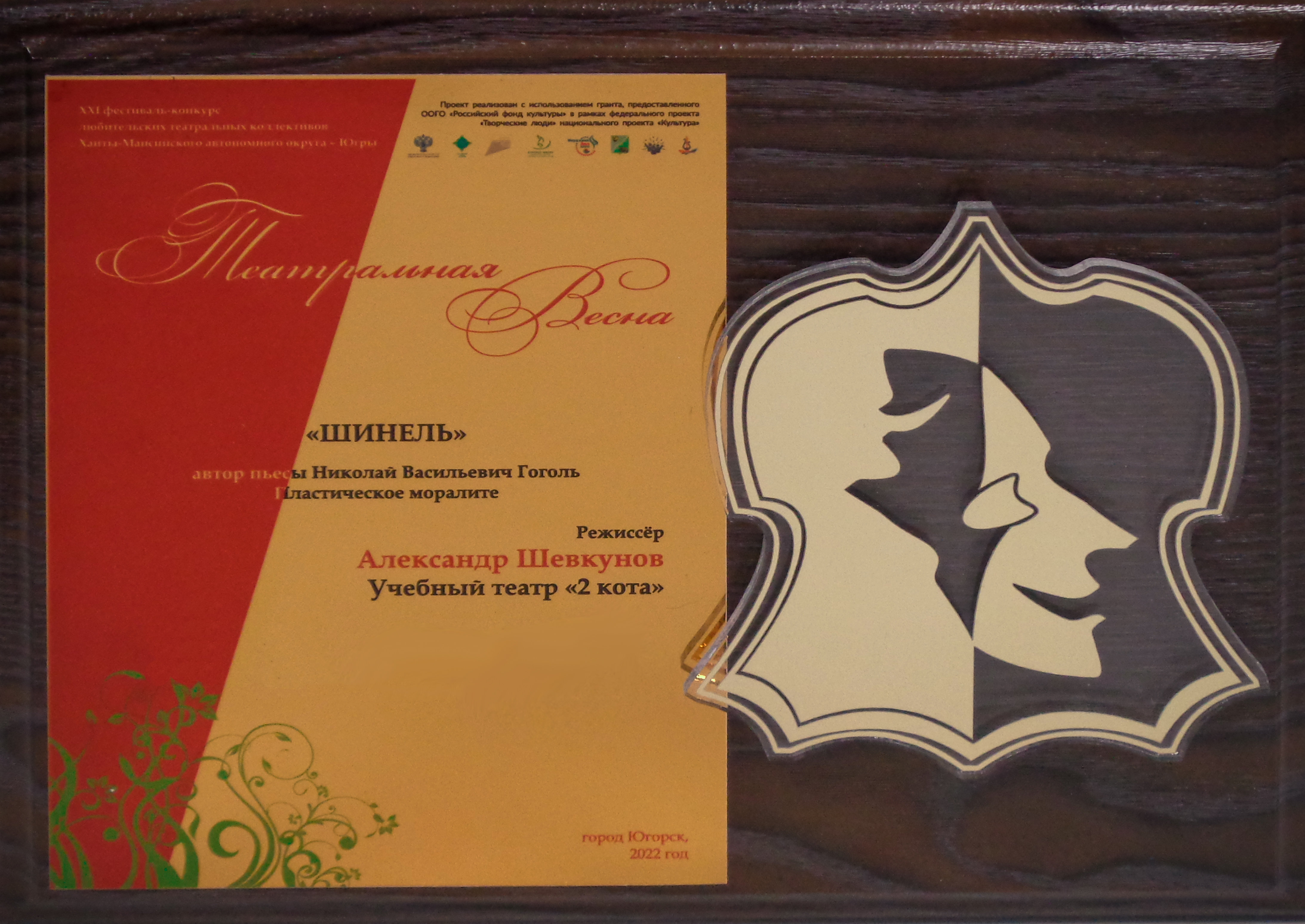 По итогам экспертной оценки жюри учебный театр «2 кота» Сургутского госуниверситета удостоен диплома первой степени в номинации «Лучший спектакль для юношества» и сертификата на 20 000 рублей за постановку пластического моралите по одноименной пьесе Николая Васильевича Гоголя «Шинель».