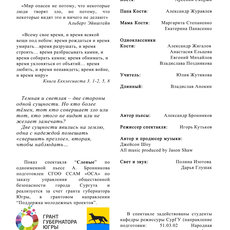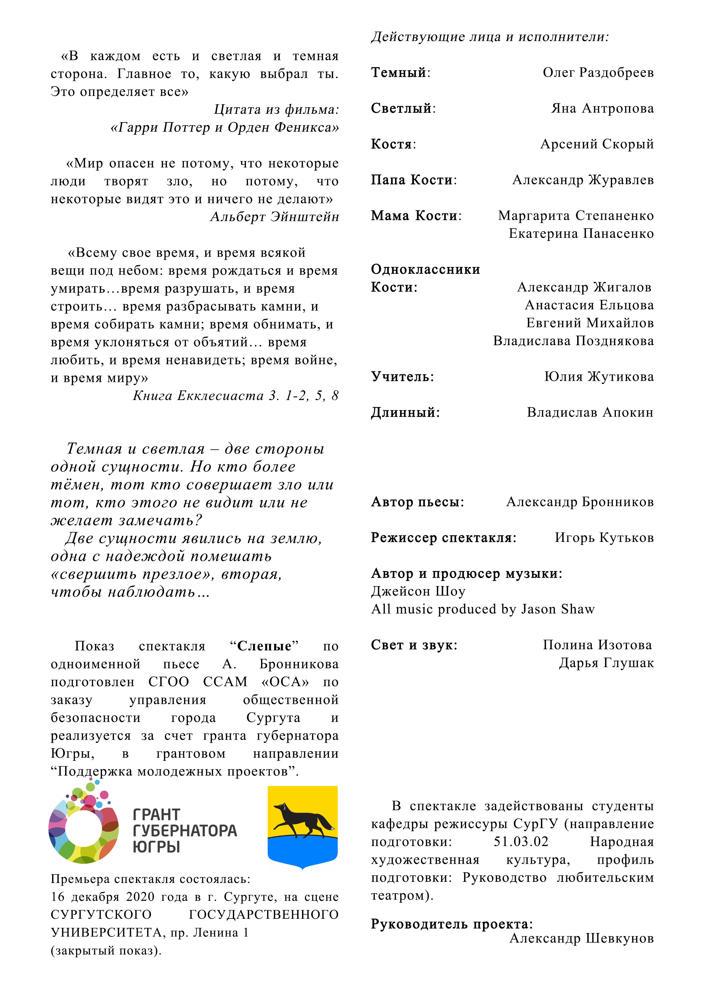 Кафедра режиссуры СурГУ приглашает Вас на бесплатный показ спектакля «Слепые», где раскрыты причины формирования радикального мышления у подростков. Действие спектакля основано на реальных событиях, произошедших в американской школе «Колумбайн» весной 1999 года, когда двое вооруженных учеников старших классов убили 13 человек, ранили 24 жителя.