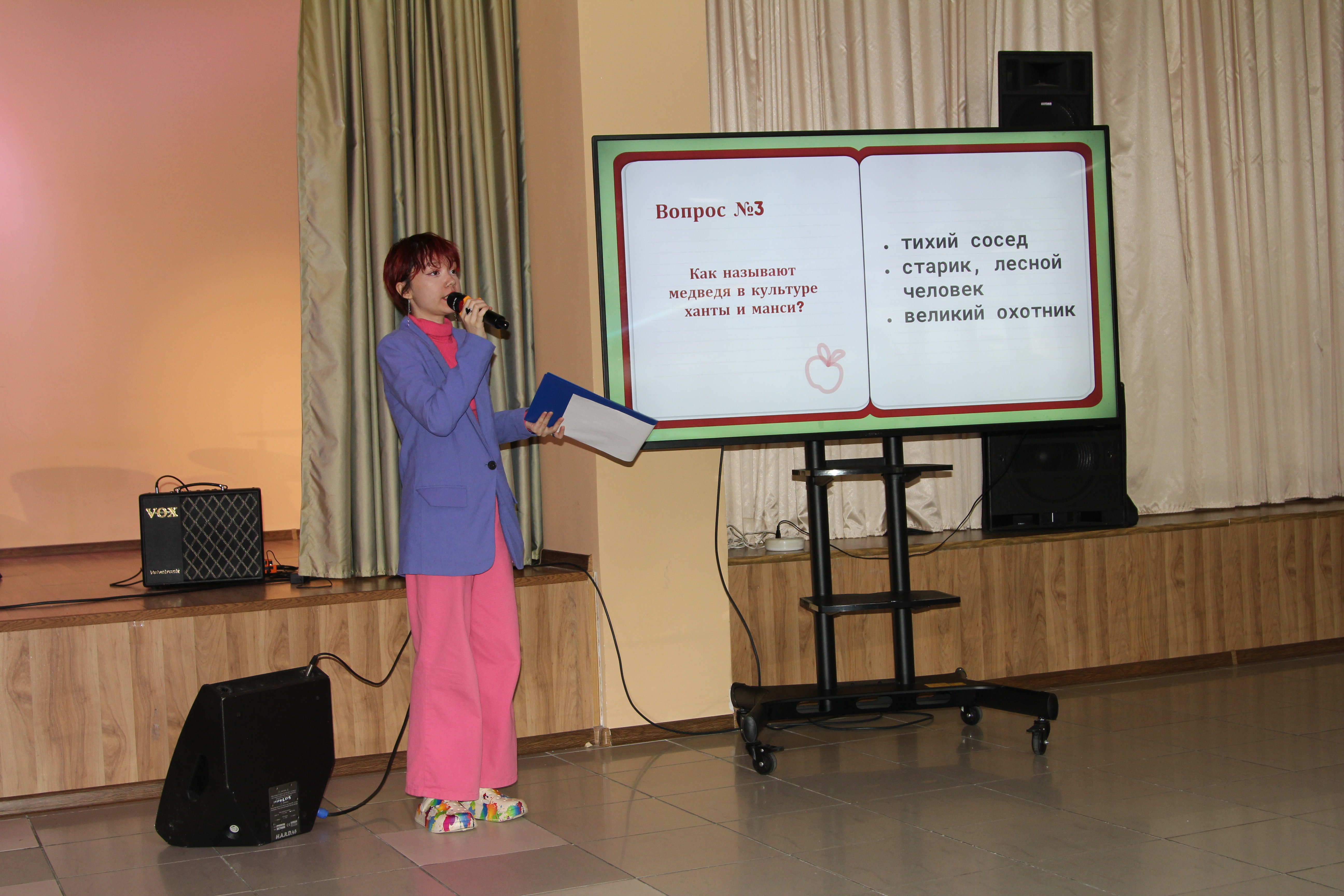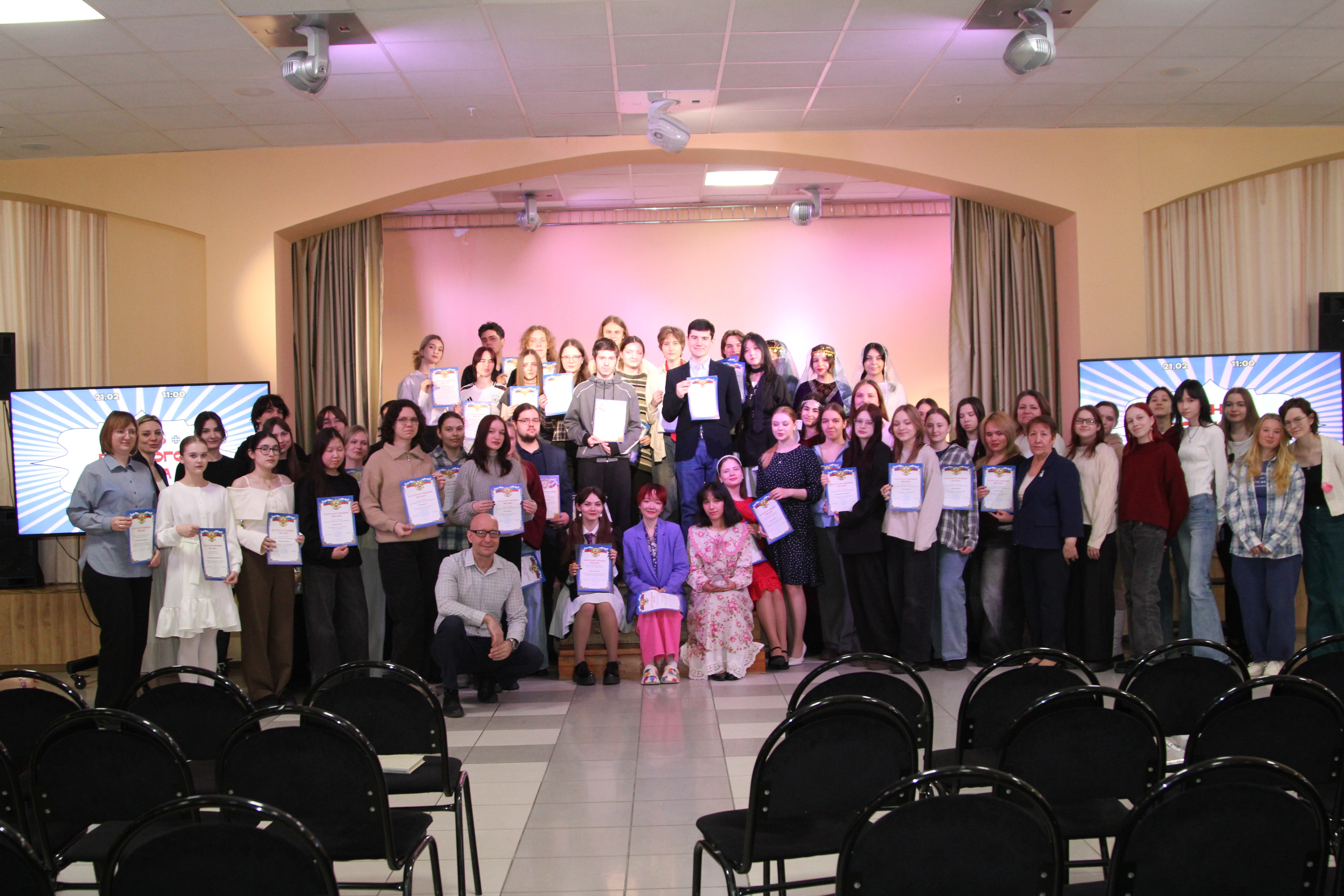 По окончании квиза для продолжения программы фестиваля волонтеры проводили гостей в многофункциональный зал СурГУ, где их встретили постоянные ведущие наших творческих мероприятий Вероника Гизатова и Никита Дорофеев, а также студенты 1–4-х курсов направления «лингвистика».