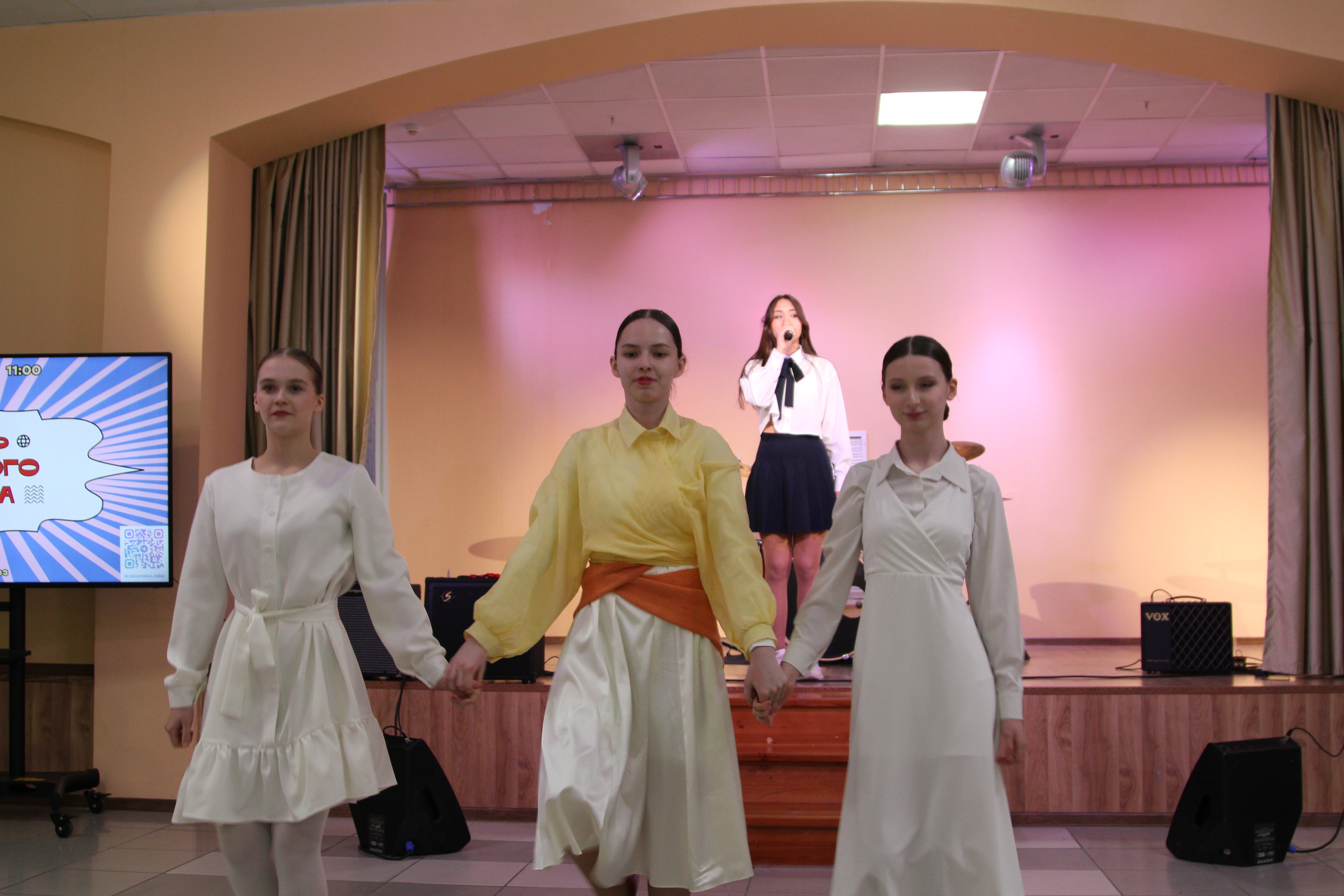 Далее в порядке очередности на сцену выходили студенты, представители разных национальностей: наши гости, учащиеся МБОУ СОШ № 46 декламировали стихотворение «Богиня солнца» с исполнением хантыйского танца с бубном, чтобы напомнить родной язык коренного народа нашего региона. Студент 1-го курса Сергей Михальков выступил со стихотворением Александра Блока «Россия». Группа The Stockings в составе Вероники Гизатовой, Софьи Гончарук, Никиты Дорофеева, Степана Панова, Евы Чугай, Максима Дмитренко исполнила песню Carpe Diem на словенском языке. Студентка 1-го курса Рима Арутюнян в ритме танца декламировала на армянском языке стихотворение о родине, а студенты 3-го курса Денис Кривелёв, Виктория Лаврова, Гюнель Бадалова, Ханымгюль Сейфуллаева, Камилат Чистякова представили номер из азербайджанской культуры «Проводы невесты». Студент 1-го курса Имран Гардалоев на чеченском языке прочел стихотворение «Родина» (автор М. Дикаев).
