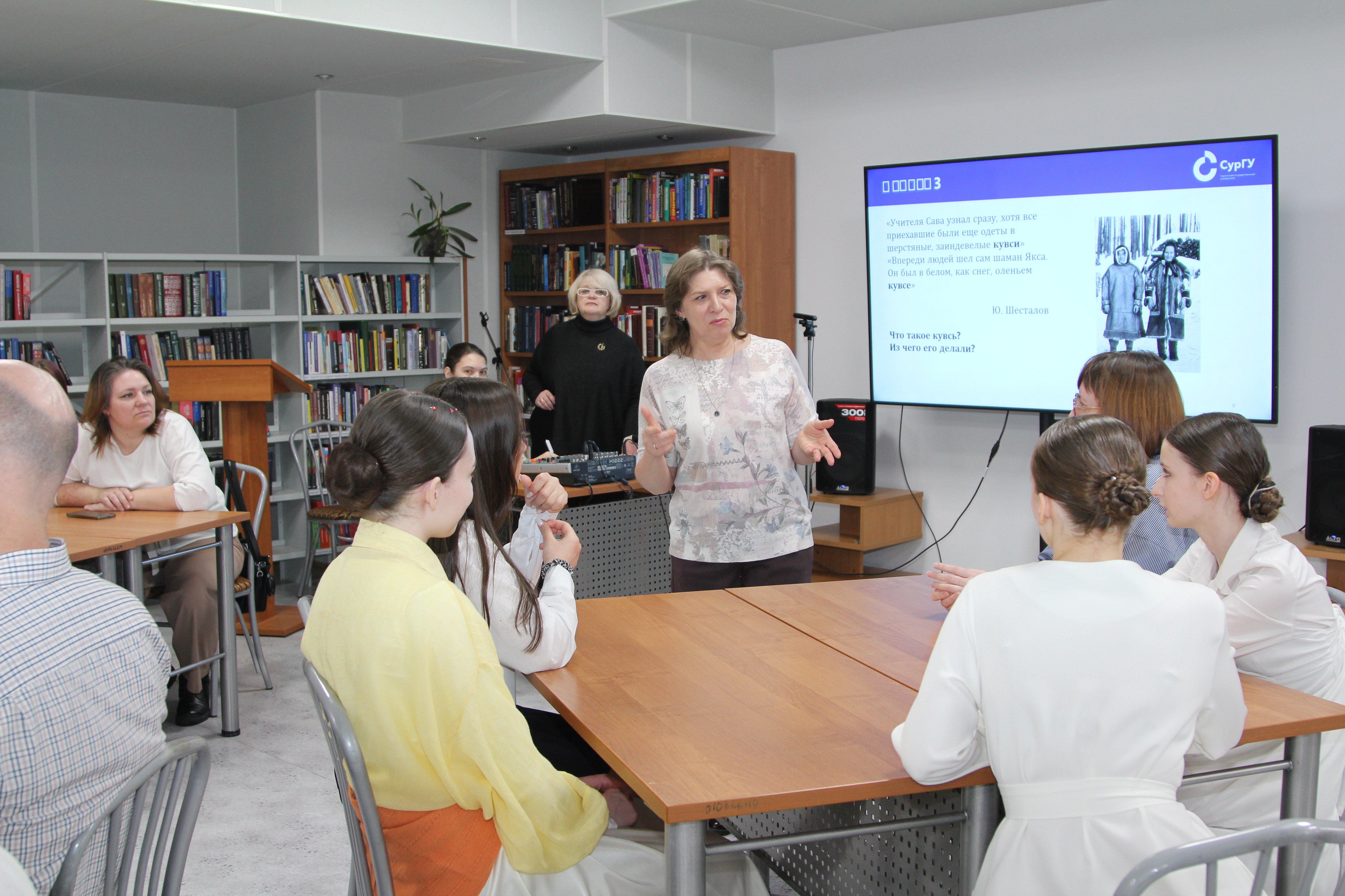 Далее для проведения литературного квиза гостей мероприятия пригласили в зал социальной литературы Библиотечно-информационного центра СурГУ. Участники квиза: преподаватели и студенты 2-го курса направления «лингвистика», а также обучающиеся общеобразовательных школ города Сургута узнали об истории и культуре коренных народов Югры, традициях и верованиях народов ханты и манси. Вопросы интерактивной программы по произведениям югорских писателей Е. Айпина и Ю. Шесталова составили доценты кафедры лингвистики и переводоведения Александра Хадынская и Татьяна Гришенкова, которые уже несколько лет занимаются изучением их творчества на профессиональном уровне.