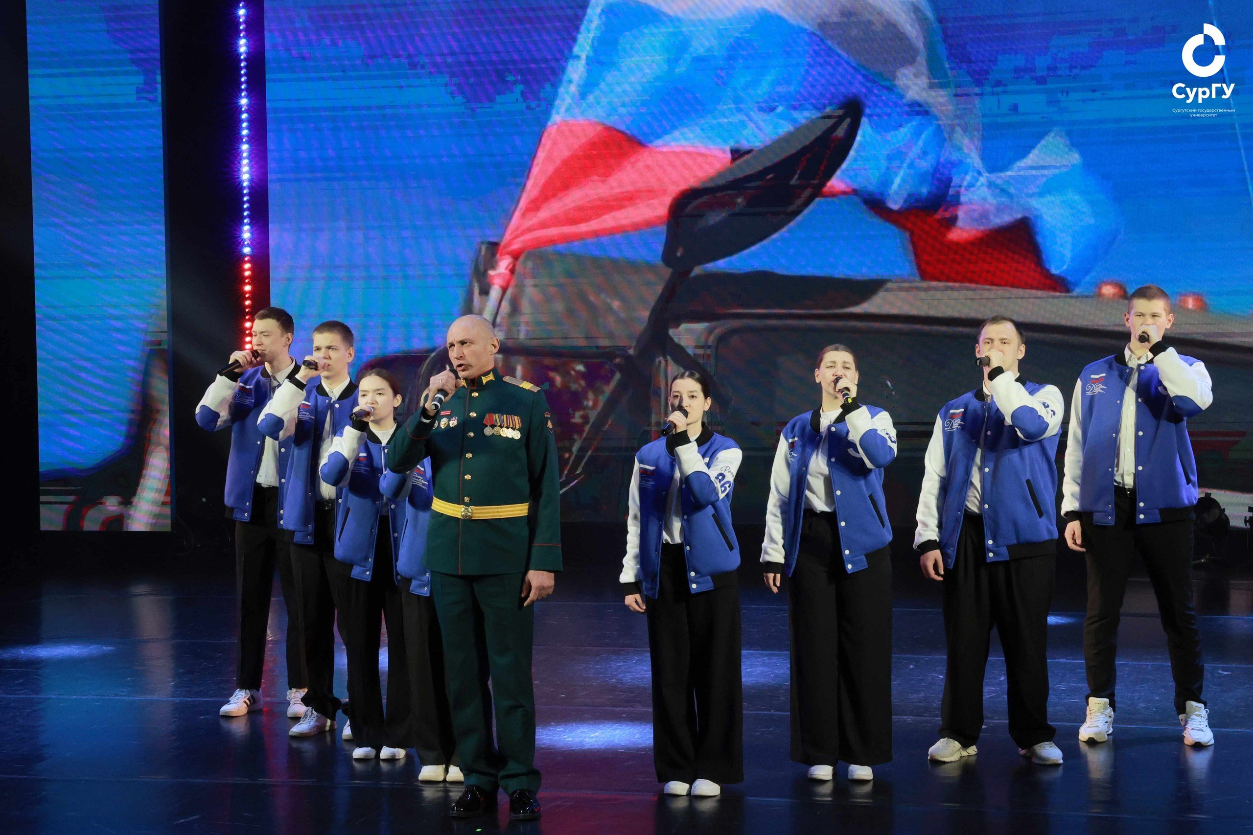 Почетным гостем праздничного концерта стал действующий участник СВО и бард Иван Сироткин. Для зрителей он исполнил две известных песни советских лет – «Темная ночь» и «Воспоминания о пехоте». Гость также похвалил молодежь, отметив ее высокий патриотизм и неравнодушие к судьбе Родины. Вместе с вокальным коллективом студентов СурГУ Иван Сироткин исполнил песню «Только вперед».