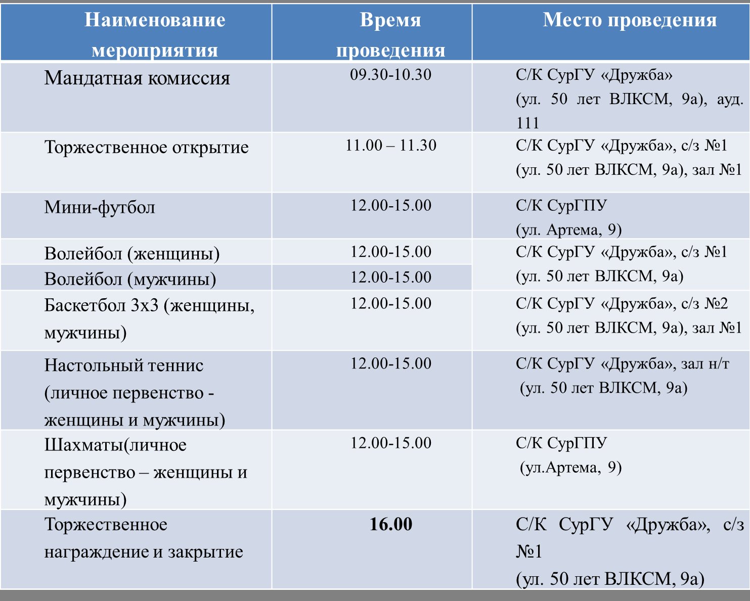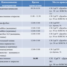 В рамках чемпионата пройдут соревнования по волейболу и стрит-болу (мужские, женские команды), настольному теннису, шахматам и мини-футболу.